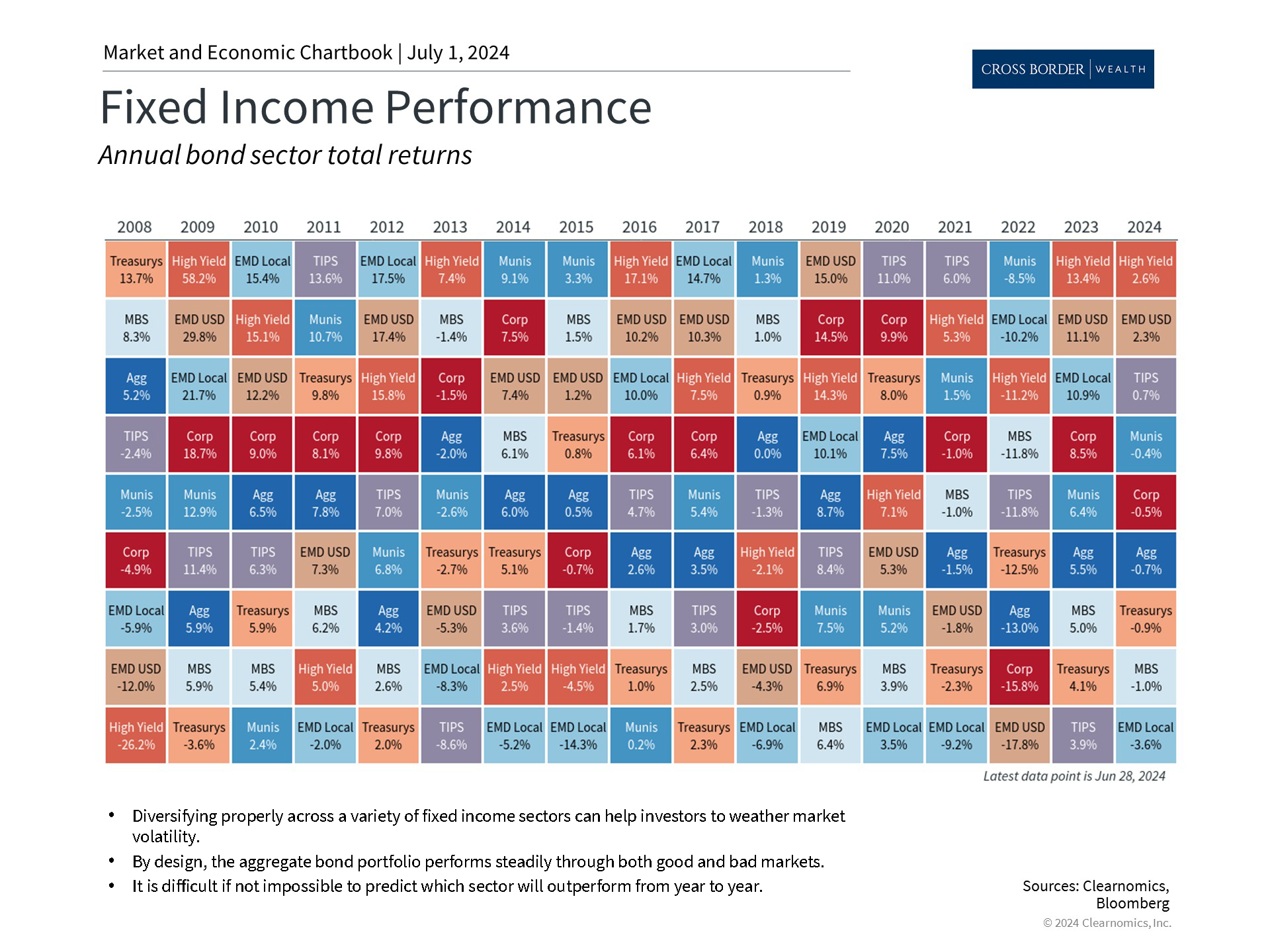 Of course, the market’s focus will now shift toward major events in the second half of the year. Perhaps the most notable is the upcoming presidential election. As investors prepare to cast their ballots in November, they will also wonder what each political party could mean for their portfolios and financial plans. Investors will also watch the timing and number of Fed rate cuts closely since lower rates are generally positive for both stocks and bonds.
