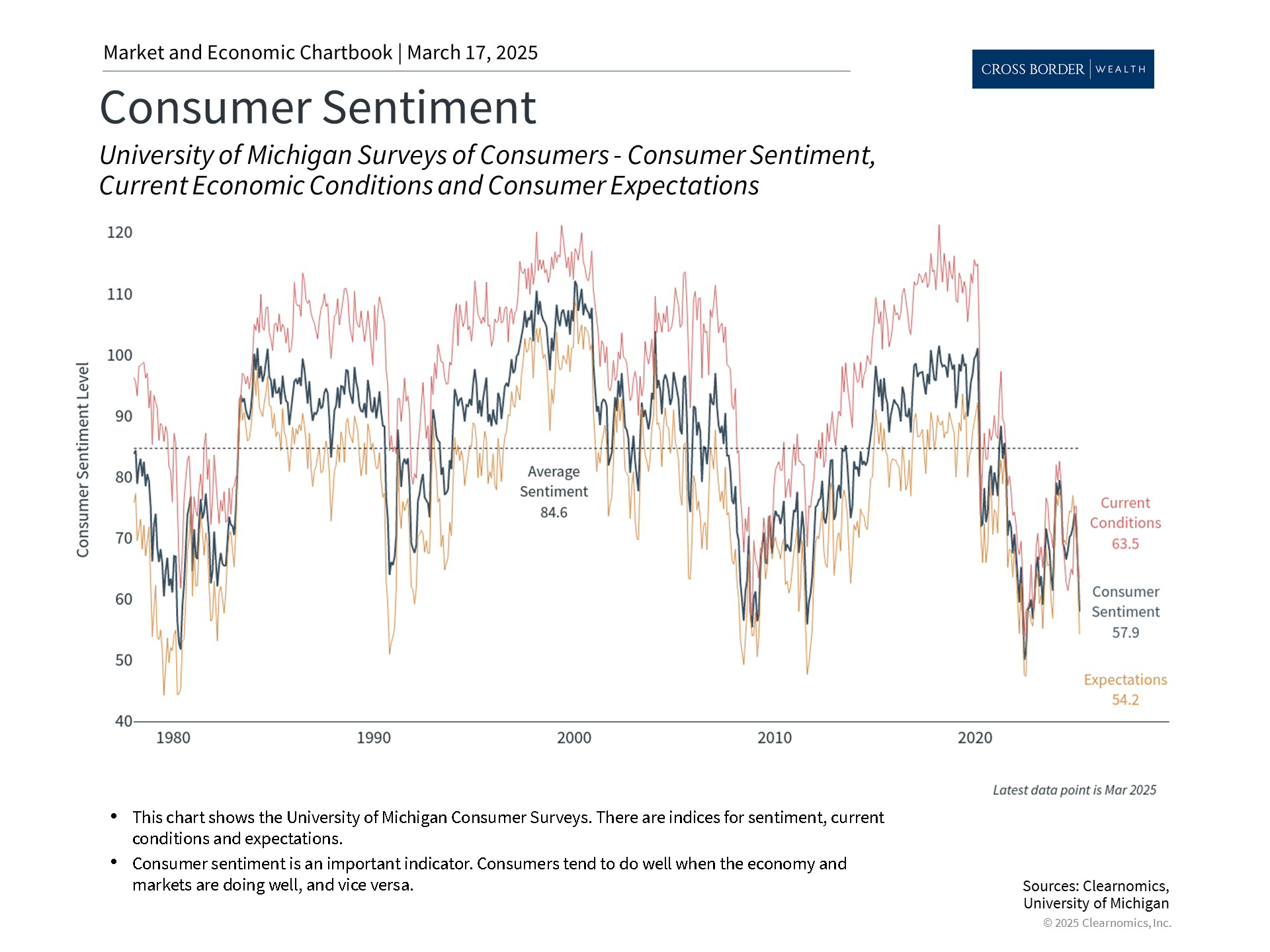 Recent data suggest that consumer sentiment, which measures how consumers feel about current and future conditions, has worsened alongside the stock market. According to the University of Michigan Surveys of Consumers, overall consumer sentiment has fallen to a level of 57.9 from a high of 79.4 a year ago, and is approaching the historic low of 50.0 in mid-2022. Much of this is driven by the expectation among consumers that inflation could rise as high as 4.9% in the coming year.